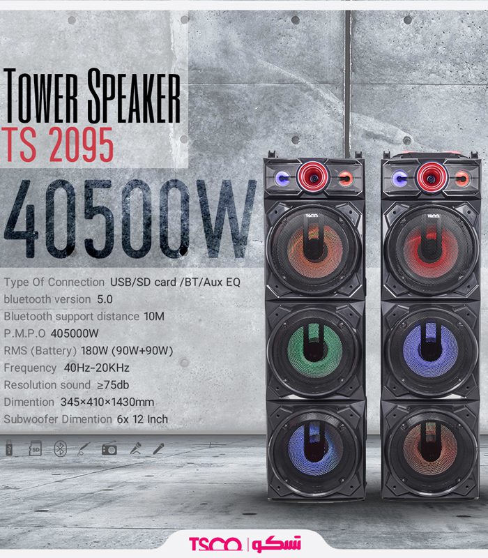 اسپیکر تسکو مدل TS 2095 در ابعاد 1430*410*345 میلی متر با وزن 29 کیلو گرم در رنگ مشکی تولید شده است.این اسپیکر دارای دامنه فرکانس 20_30KHz.