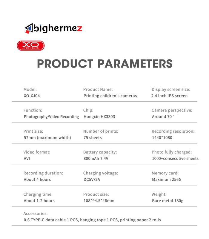 دوربین عکاسی چاپ فوری XO XJ04، بهترین انتخاب برای شماست. با این دوربین، به کودک خود اجازه دهید تا دنیای اطراف را از نگاه خود ببیند و خاطرات زیبایی را برای خود و خانواده‌اش بسازد.