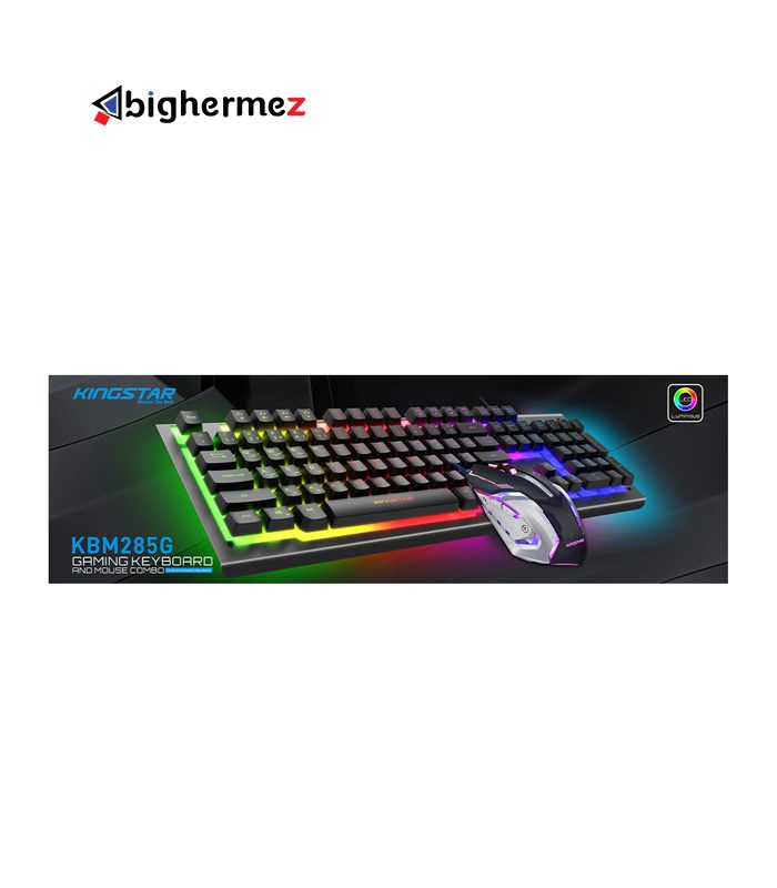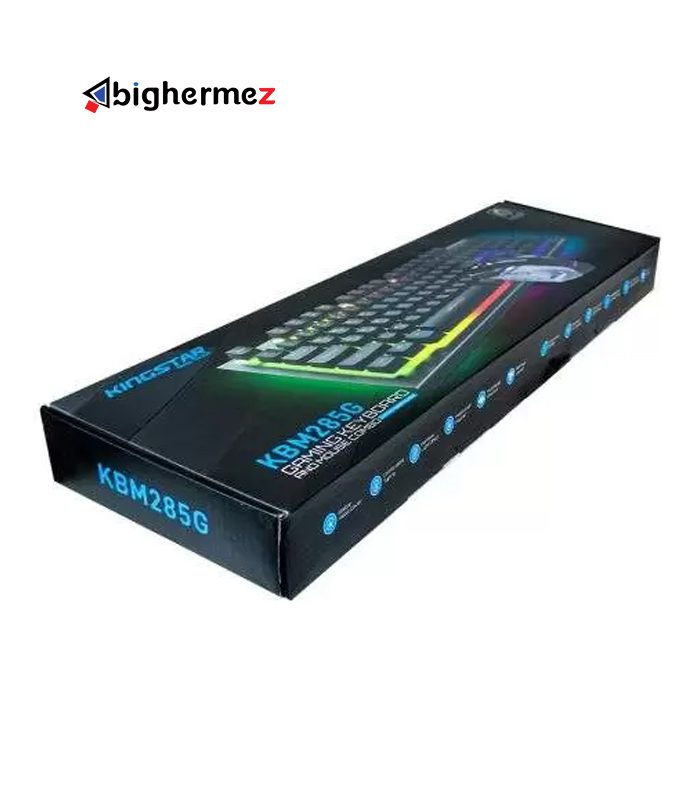 ست گیمینگ کینگ استار مدل KBM285G دارای طراحی ارگونومیک و دکمه های حساس هنگام فعالیت میباشد. از مشخصههای این محصول کمپانی کینگ استار، عنوان کمبو میباشد. این نام به جهت وجود دو محصول ماوس و کیبورد در یک پک است. کیبورد کمبو به گونهای طراحی است که زیر کلیدها نورپردازی زیبای RGB دارد. روکش ژلاتینی بسیار با کیفیت زیر کلیدهای این کیبورد موجب میشود تا طول عمر این محصول به 5میلیون بار کلیک افزایش پیدا کند که این میزان قابل توجهی برای کاربران محصولات گیمینگ میباشد.
