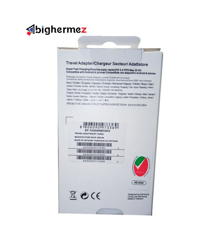 شارژر دیواری 3پین 25W سامسونگ مدل EP-TA800 عرب