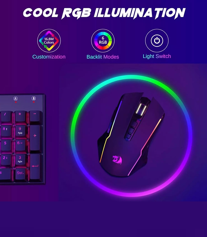 نورپردازی RGB جذاب با الگوهای قابل برنامه‌ریزی به موس M914 RGB ظاهری زیبا و منحصربه‌فرد می‌بخشد. شما می‌توانید با استفاده از نرم‌افزار Redragon، رنگ و الگوی نورپردازی را به دلخواه خود تغییر دهید و آن را با سایر لوازم جانبی گیمینگ خود هماهنگ کنید.