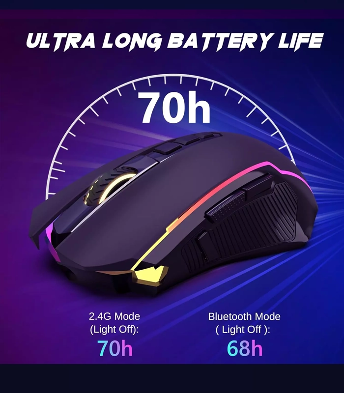 موس M914 RGB با ارائه سه حالت اتصال (سیم، بی‌سیم 2.4G، و بلوتوث)، انعطاف‌پذیری بالایی را برای کاربران فراهم می‌کند. شما می‌توانید از اتصال بی‌سیم 2.4G برای بازی‌های سریع و بدون تاخیر استفاده کنید، از بلوتوث برای اتصال به دستگاه‌های مختلف بدون نیاز به دانگل USB بهره ببرید، و در صورت نیاز یا اتمام باتری، به‌راحتی از کابل Type-C جداشدنی برای اتصال سیمی و شارژ موس استفاده کنید.