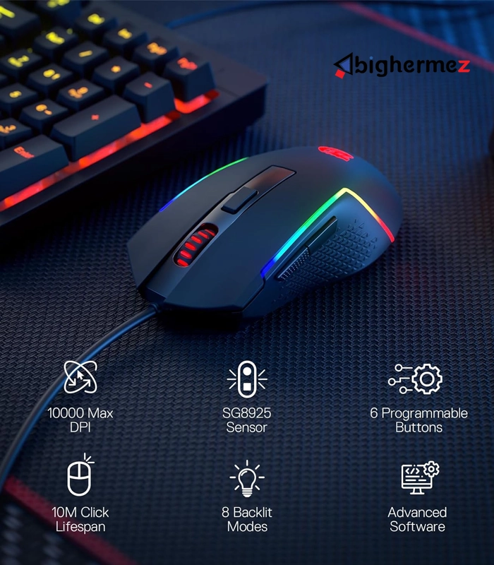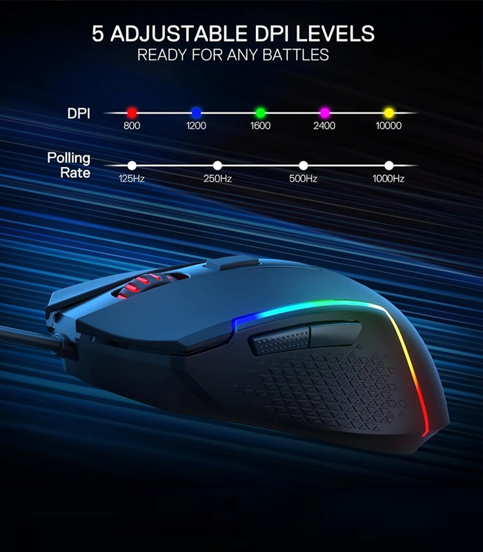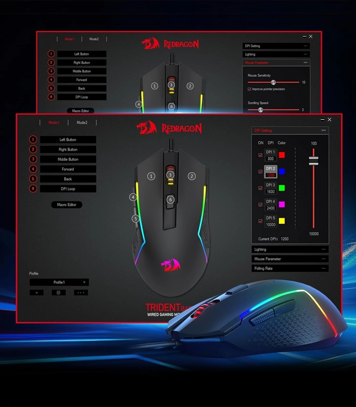 Redragon M616 TRIDENT با سنسور اپتیکال دقیق و قابلیت تنظیم DPI تا 10000، به گیمرها این امکان را می‌دهد تا دقت و سرعت حرکت را متناسب با سبک بازی خود تغییر دهند. وجود 6 دکمه قابل برنامه‌ریزی نیز به شما این امکان را می‌دهد تا فرمان‌های دلخواهتان را تنها با یک کلیک اجرا کنید، خصوصاً در بازی‌های MMO و MOBA که نیاز به عملکرد سریع دارند.