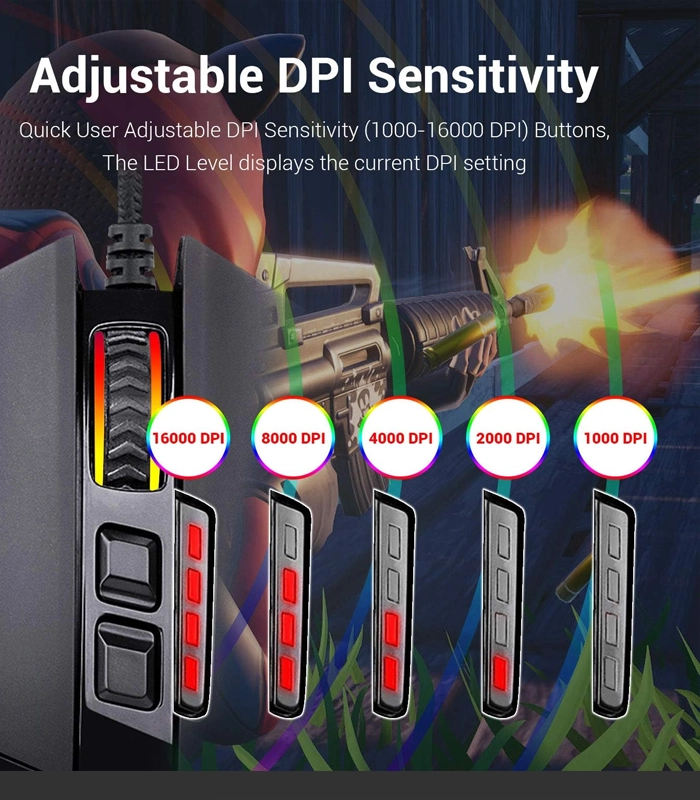 موس گیمینگ ردراگون Sniper M801 با دقت بالا و تنظیمات DPI متنوع، از 100 تا 16000 DPI، به شما امکان می‌دهد تا حساسیت موس را بر اساس نیازهای مختلف بازی تنظیم کنید. این ویژگی به شما کمک می‌کند تا با دقت بیشتری هدف‌گیری کنید و سریع‌تر واکنش نشان دهید. چه در بازی‌های سریع و چه در بازی‌های استراتژیک، این موس عملکرد بی‌نظیری را ارائه می‌دهد.