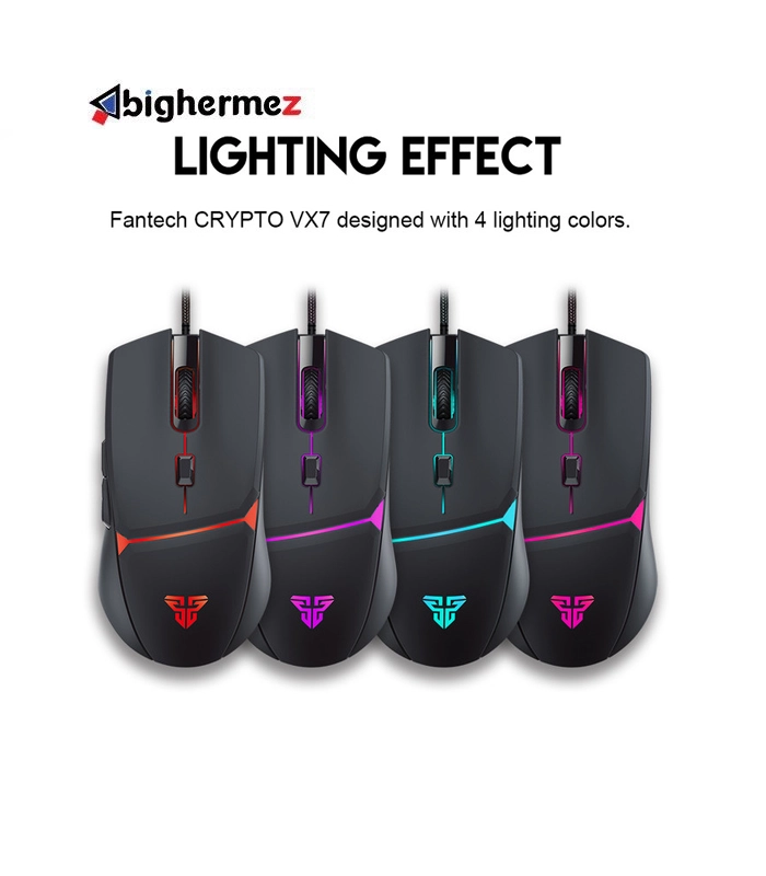 نوع اتصال ماوس گیمینگ فنتک VX7 از طریق کابل از جنس نایلون بافت میشود به طول 1.8 متر می باشد. ماوس VX7 دارای 6 کلید با قابلیت برنامه ریزی می باشد. همچنین دارای نورپردازی با 4 رنگ متفاوت نیز می باشد که جلوه بصری زیبایی به این ماوس بخشیده است.