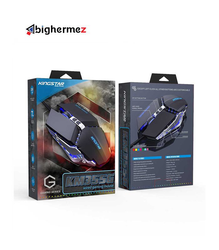 ماوس مخصوص بازی کینگ استار مدل KM355G از طریق کابل و پورت USB به کامپیوتر متصل میشود. طول کابل این ماوس برابر 1.8 متر و جنس رویه کابل از کنف میباشد.طراحی ارگونومیکی ماوس گیمینگ KM355G باعث میشود. کاربر پس از استفاده مداوم احساس خستگی نکند. ضربهپذیری کلیدهای این محصول برابر 3 میلیون بار است. یکی از مهمترین مشخصات ماوسهای مخصوص بازی برند کینگ استار مدل KM355G رزولوشن قابل تنظیم تا 3200 DPI آن است.