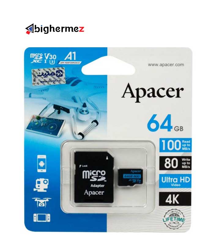 کارت حافظه SDHC اپیسر مدل V30 R100 به ظرفیت 64 گیگ برای ذخیره سازی با استاندارد کلاس 30 برای ضبط ویدئوهای UHS برابری میکند. سرعت حداقل نوشتن این محافظه 30 مگابایت بر ثانیه است. و برای ذخیره سازی ویدئوها با کیفیت 4K Ultra HD, 3D و عکاسی در مود عکاسی پیاپی Brust Mode کاملن مناسب است.
