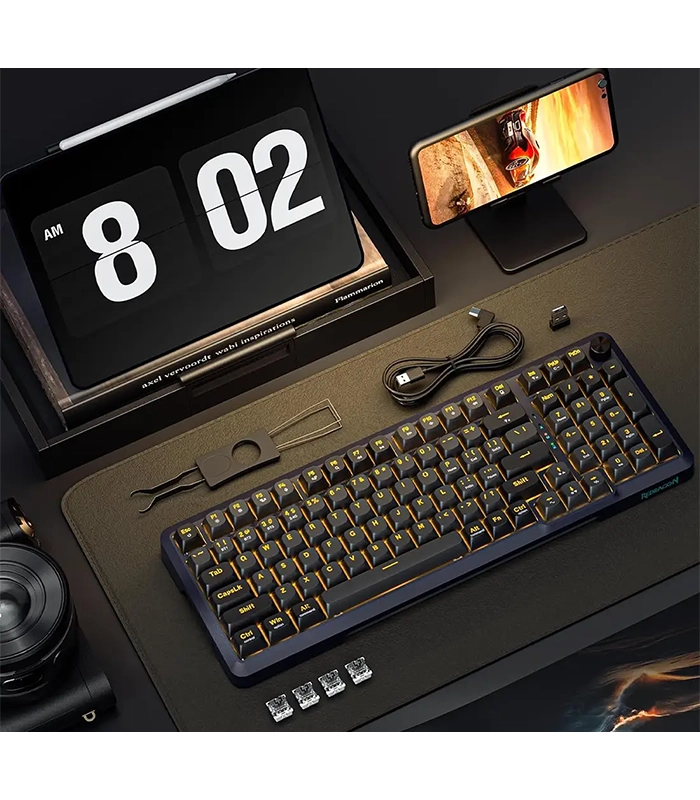 کیبورد K688 GB PRO با پشتیبانی از سه روش اتصال مختلف، انعطافپذیری بینظیری را برای شما فراهم میکند. شما میتوانید از طریق بلوتوث 5.0، دانگل USB 2.4GHz، و کابل USB-C به کامپیوتر، تبلت، لپتاپ، و حتی کنسولهای بازی Xbox و PS4/PS5 متصل شوید. همچنین، میتوانید به طور همزمان به پنج دستگاه مختلف متصل شوید و با استفاده از ترکیب کلیدهای FN، به راحتی بین آنها جابجا شوید. این قابلیت به شما کمک میکند تا در هر شرایطی و با هر نوع دستگاهی به راحتی از کیبورد خود استفاده کنید.