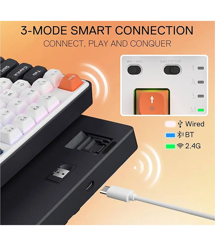 کیبورد K689 WBO PRO با پشتیبانی از سه روش اتصال مختلف، انعطافپذیری بینظیری را برای شما فراهم میکند. شما میتوانید از طریق بلوتوث 3.0/5.0، دانگل USB 2.4GHz، و کابل USB-C به کامپیوتر، تبلت، یا گوشی هوشمند خود متصل شوید. همچنین، میتوانید به طور همزمان به چندین دستگاه مختلف متصل شوید و با استفاده از کلیدهای ترکیبی FN، به راحتی بین آنها جابجا شوید. این قابلیت به شما کمک میکند تا در هر شرایطی و با هر نوع دستگاهی به راحتی از کیبورد خود استفاده کنید.