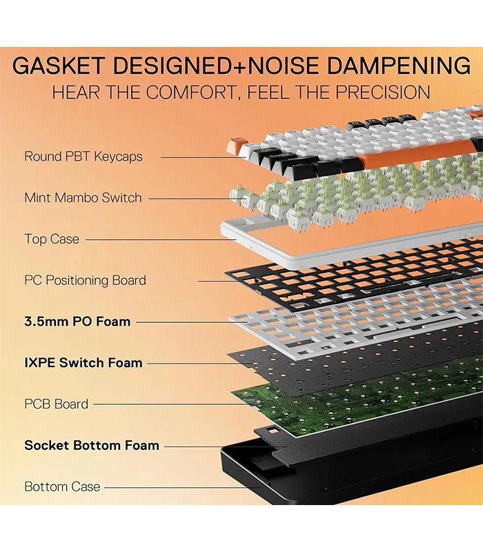 کیبورد K689 WBO PRO دارای ساختار گسکت است که باعث میشود حس تایپ نرمتر و منعطفتر باشد. این ساختار با استفاده از یک لایه سیلیکونی یکپارچه و شکافهای مخصوص روی PCB، مقاومت و پایداری کیبورد را بهبود میبخشد. همچنین، این ساختار به کاهش صدای اضافی کیبورد نیز کمک میکند.
