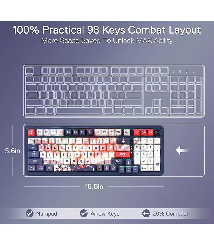 کیبورد EISA K686 PRO با طراحی 98 کلید تاکتیکی، عملکرد کامل کیبوردهای 100% را حفظ می‌کند. در حالی که اندازه آن را 20% کوچکتر کرده است. این طراحی نوآورانه به شما اجازه می‌دهد که از تمامی قابلیت‌های کیبوردهای بزرگتر بهره‌مند شوید، اما فضای بیشتری بر روی میز کار خود داشته باشید.